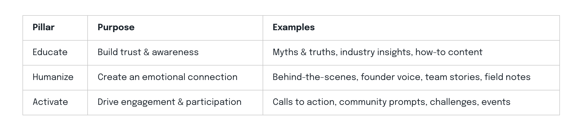The most effective purpose-led brands don’t post everything about everything. They focus on a few repeated narrative threads.